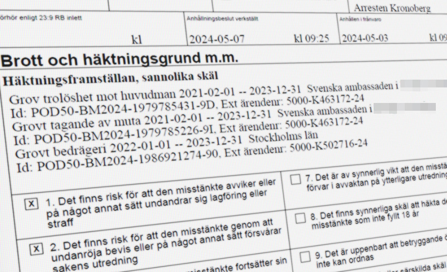 Brotten, som ska ha begåtts från 1 januari 2021 fram till sista december förra året, gäller emellertid inte den ambassad som 53-åringen arbetar på nu, utan den svenska ambassad han arbetat på tidsigare. Det grova bedrägeriet har enligt framställan begåtts i Sverige, men de övriga brotten på den aktuella ambassaden.