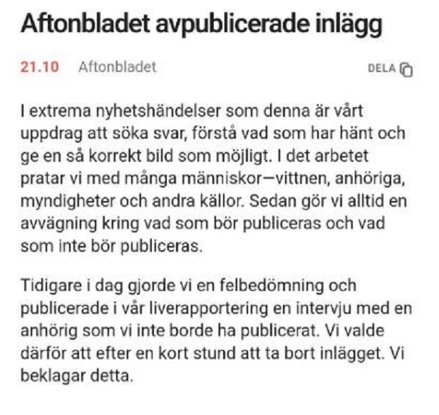 – Vi gjorde den här publiceringen. Det borde vi inte ha gjort. Vi tog bort inlägget och bad om ursäkt för det, säger ställföreträdande chefredaktör Martin Schori till statsradion.