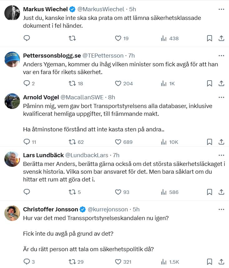 Ygeman påminns också om att han kort innan skandalen med Transportstyrelsen anklagat SD för att vara ett säkerhets- och utrikespolitiskt hot. S-toppen har valt att inte gå i svaromål med någon av de många kritikerna på X.