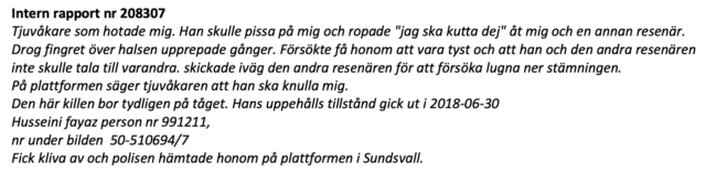 Det framgår av en händelserapport från SJ att deras personal tagit tjuvåkare på tåget. Afghanen ska då ha hotat den kvinnliga tågpersonalen med att han skulle ”pissa” på henne och mordhotade även med orden ”jag ska kutta (knivhugga reds. anm.) dig”.