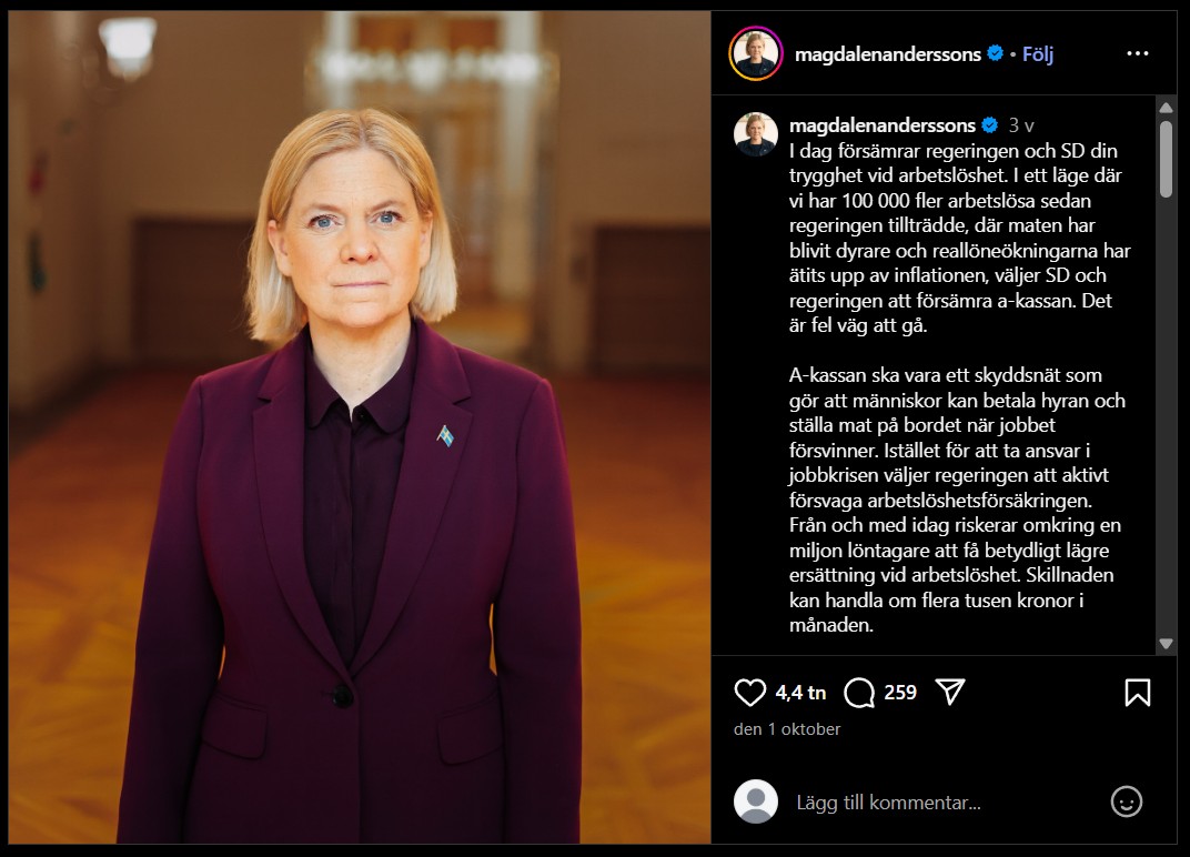I ett inlägg i sociala medier nyligen klagade Andersson också på att Tidöregeringen försöker göra det mer lönsamt att arbeta: