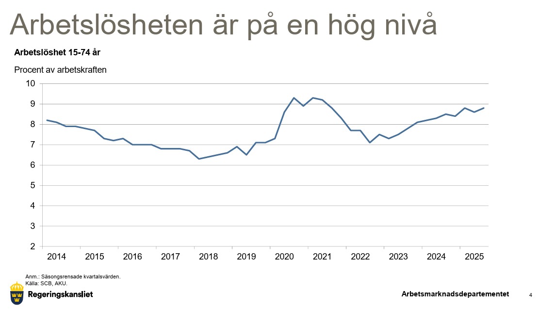 Under tredje kvartalet 2025 uppgick arbetslösheten till 8,8 procent, en liten uppgång jämfört med föregående kvartal. Många utrikes födda har svårt att komma in på arbetsmarknaden, ofta på grund av bristande språkkunskaper och kort utbildning.
