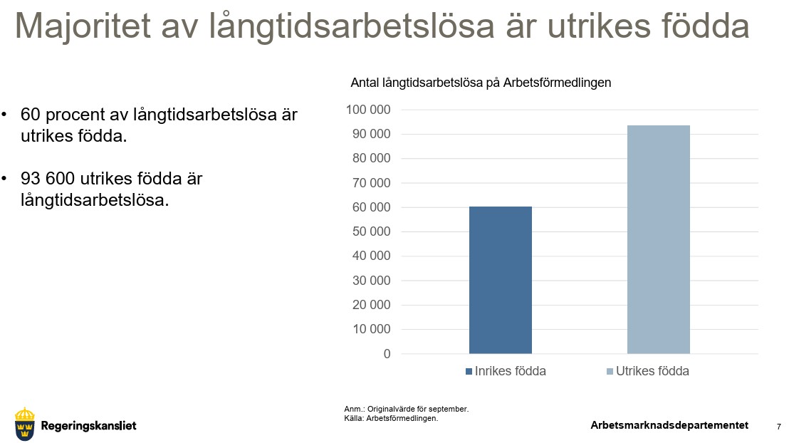 – Det är en mörk höst på arbetsmarknaden. Idag står 77 700 utrikes födda utan arbete och utbildning. Fler behöver lära sig det svenska språket, och gå utbildningar som leder till jobb. Fler barn behöver se sina föräldrar gå till jobbet, annars riskerar arbetslösheten att gå i arv, säger arbetsmarknadsminister Johan Britz (L).