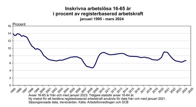 I slutet av mars var knappt 355 000 personer inskrivna som arbetslösa, vilket är en ökning med drygt 19 000 personer jämfört med för ett år sen. Antalet motsvarar en arbetslöshet på 6,7 procent.