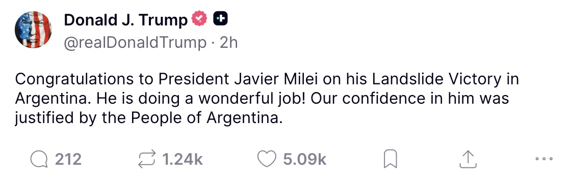 Efter mellanårsvalet har den amerikanske presidenten nu gratulerat Milei.