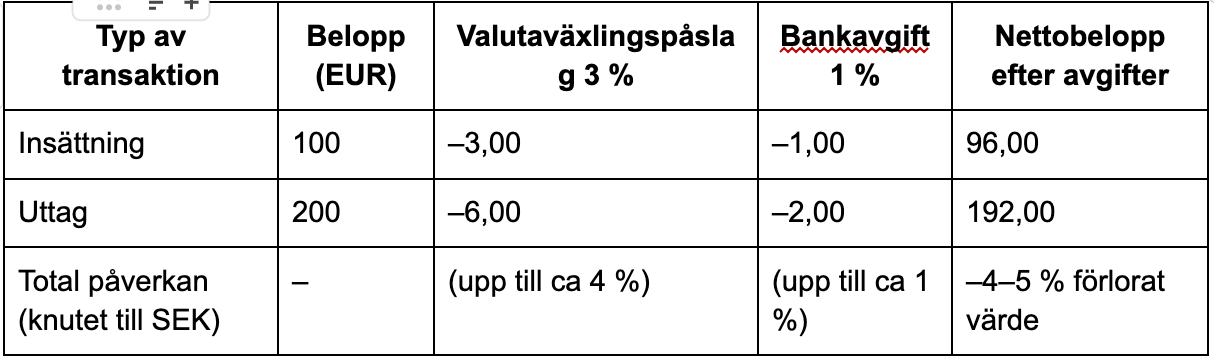 I detta exempel försvinner i storleksordningen 4–5 % av summan i avgifter och växlingar, trots att casinot kanske hävdar ”ingen avgift”. För större insättningar/uttag eller vid fler transaktioner kan den totala kostnaden bli betydande.