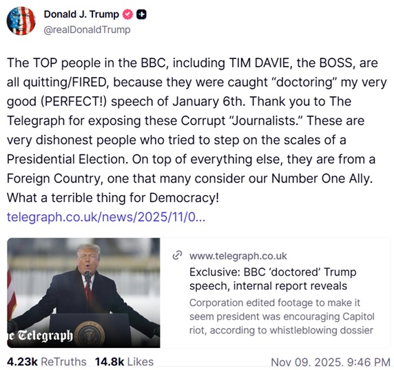 Även Vita huset har reagerat på skandalen. Vita husets pressekreterare Karoline Leavitt menar att fallet är ytterligare ett bevis på att BBC står för 100 procent falska nyheter som inte längre borde vara värda tiden på tv-skärmarna för britterna.