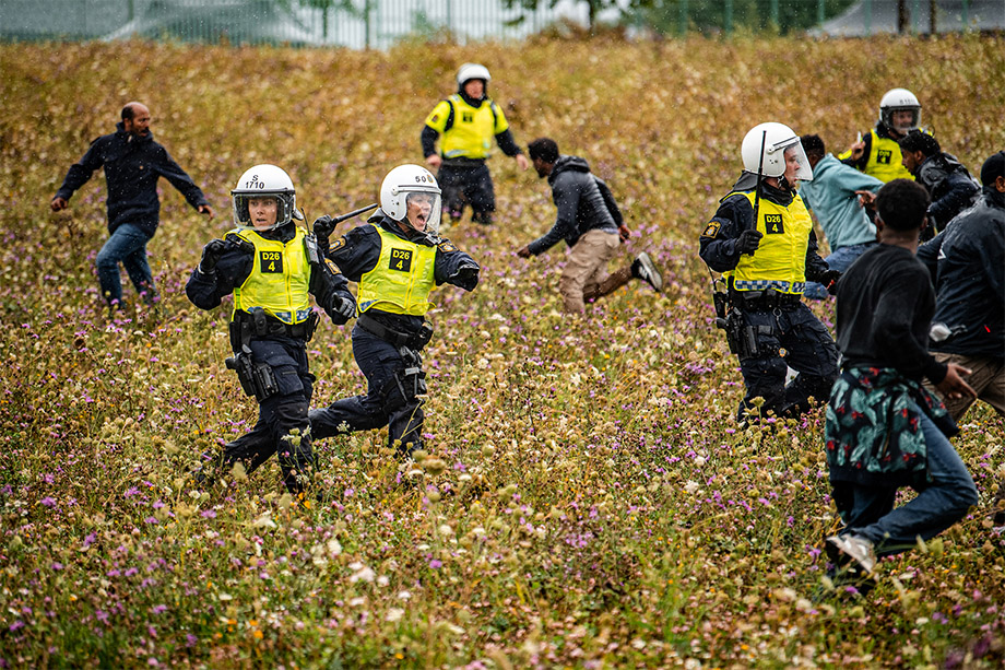 Bilden togs av frilansfotografen Alex Ljungdahl i augusti ifjol när eritreaner och kravallutrustad polis drabbade samman på Järvafältet utanför Stockholm.