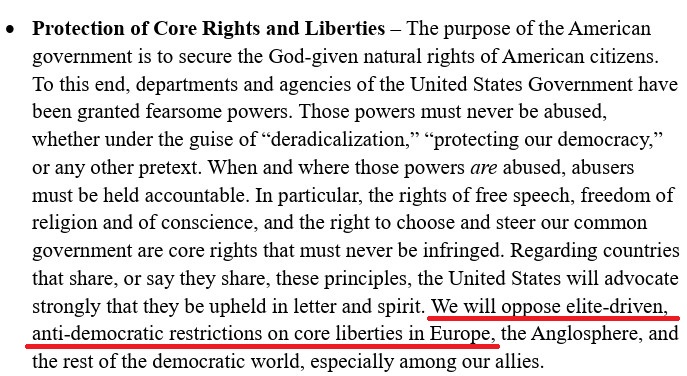 I dokumentet skriver Trump-administrationen bland annat att man kommer motsätta sig anti-demokratiska restriktioner för grundläggande friheter i Europa drivet av ”eliten”:
