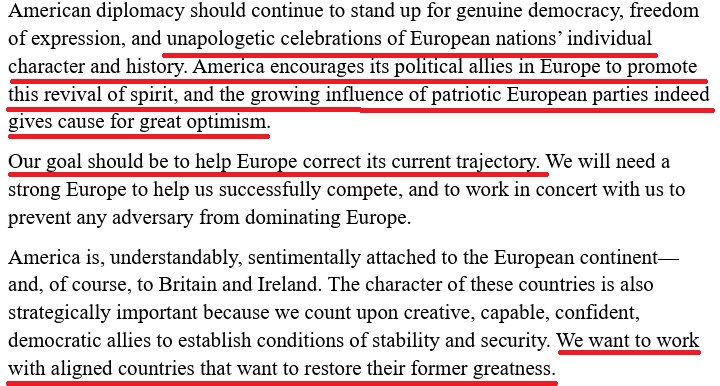 Utöver kritiken mot massinvandringen nämns även hot mot yttrandefriheten samtidigt som man ser framväxandet av nationalkonservativa partier som något positivt. Man slår också fast att USA-allierade nu måste ta huvudansvaret för sin egen säkerhet.