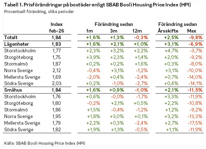 De nya siffrorna presenteras av SBAB Booli Housing Price Index (HPI) och visar att bostadspriserna steg med 1,6 procent i februari. Rensat för normala säsongseffekter och andra tillfälliga effekter ökade priserna med 0,1 procent.