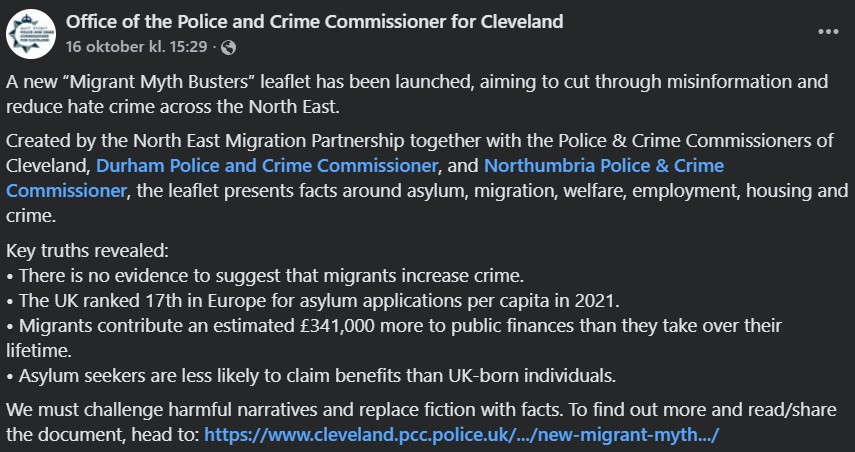 Broschyren ”Migrant Myth Busters” påstår sig krossa ”vanliga myter” om nyanlända. Det tvåsidiga dokumentet innehåller nio ”myter”, bland annat att migranter ”tömmer våra offentliga resurser” – ”tvärtom”, hävdar flygbladet, som antyder att migranter som kommer till Storbritannien kommer att bidra med mer än den genomsnittliga brittiska medborgaren.