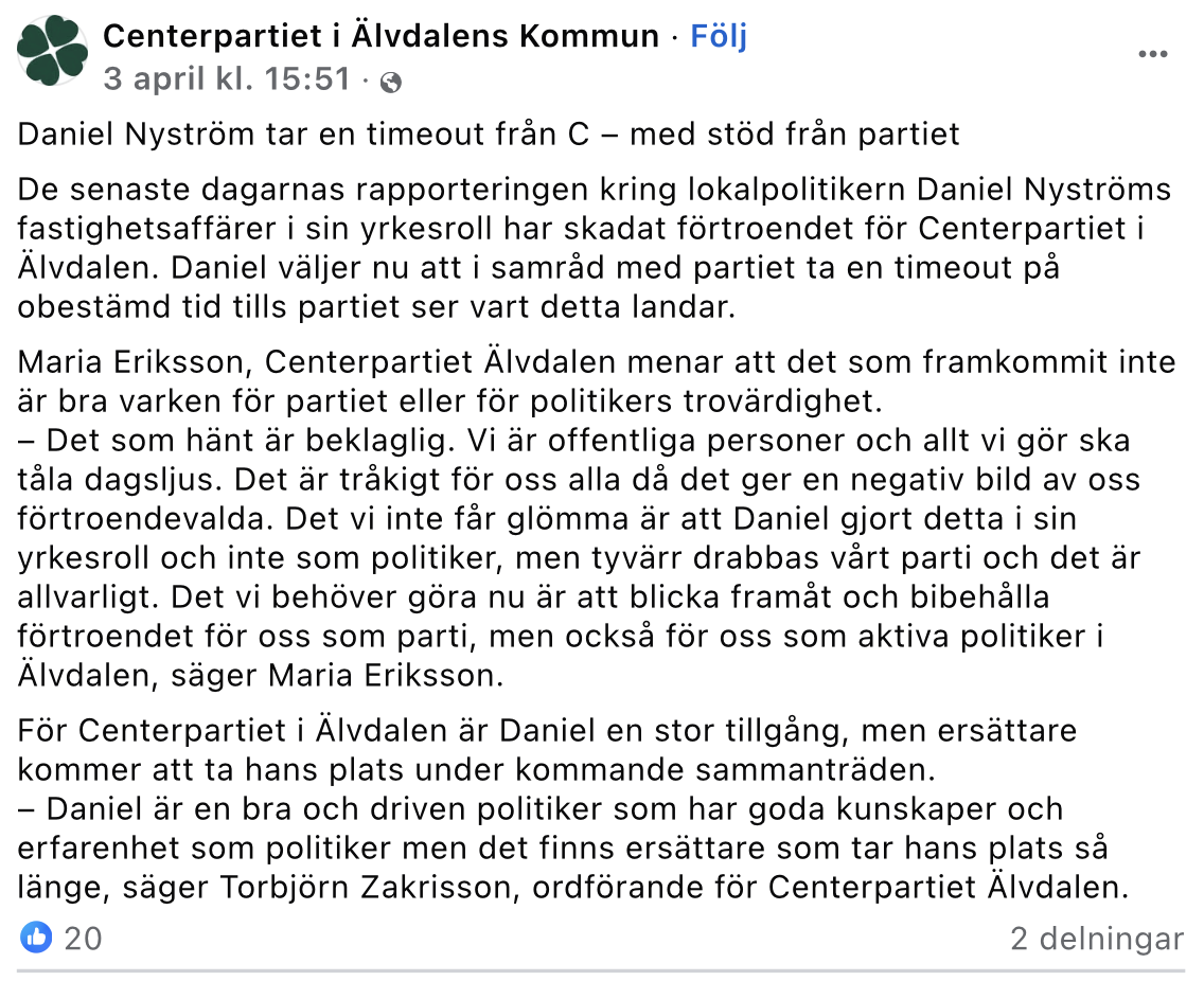 Det var i slutet av mars som Sveriges Radio P4 Dalarna publicerade en granskning om centerpartisten Daniel Nyström, som bland annat är ledamot i kommunstyrelsen och kommunfullmäktige samt tidigare varit ordförande för det kommunala fastighetsbolaget.