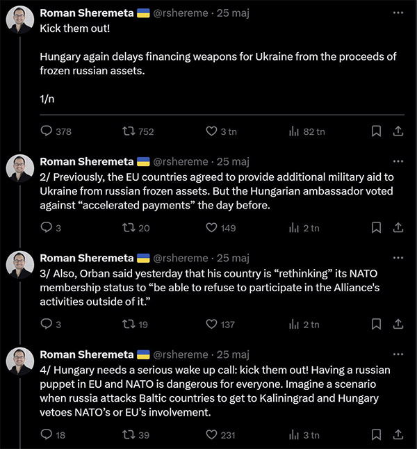 Wiesner delade den gångna helgen inlägg i sociala medier från den amerikaukrainske akademikern Roman Sheremata. Han kräver i en så kallad tråd på X att Ungern sparkas ut ur EU och Nato.