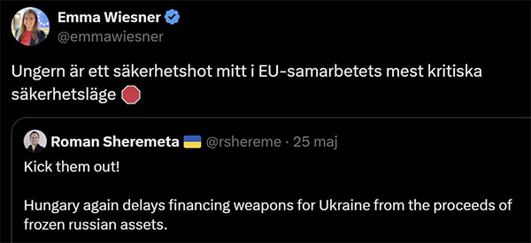 På det sociala mediet X, där Emma Wiesner delat Shermatas inlägg, skriver hon att: ”Ungern är ett säkerhetshot mitt i EU-samarbetets mest kritiska säkerhetsläge”.