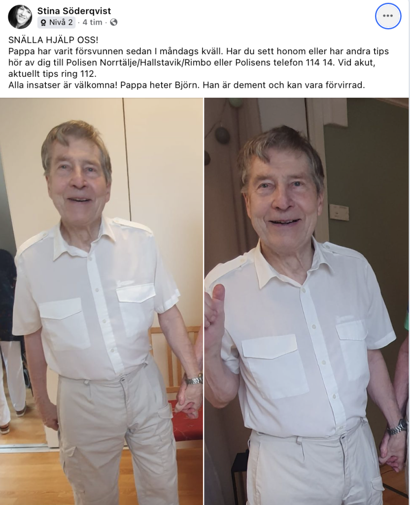 På Facebook har mannens dotter publicerat ett inlägg där hon vädjar om hjälp. Dottern skriver även att Björn är dement och kan vara förvirrad.