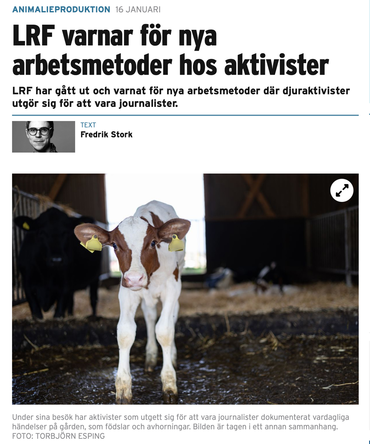 I en artikel från 2018 rapporterade tidningen Land om hur svenska lantbrukare utsattes för hot, trakasserier och intrång kopplade till djurrättsaktivism.