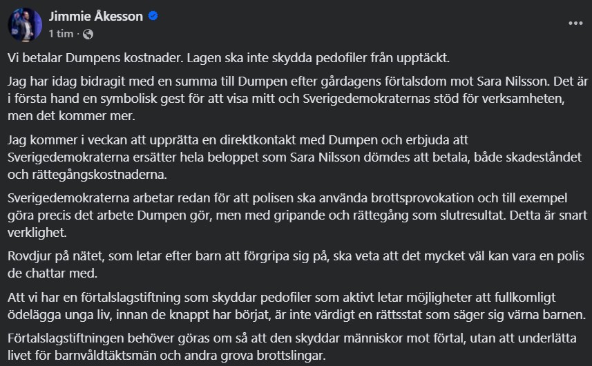 I ett inlägg på sociala medier skriver SD-ledaren att partiet kommer att betala både skadeståndet och rättegångskostnaderna: