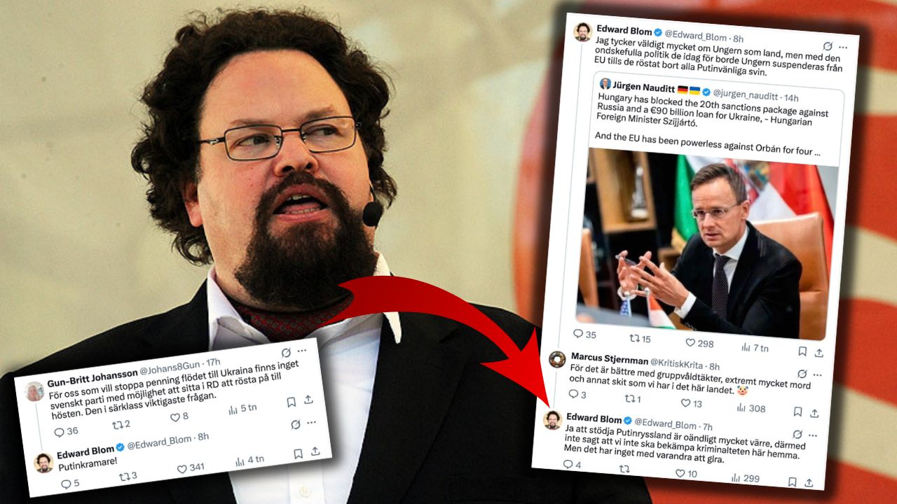 Det senaste dygnet har Blom gått hårt på sociala medier-plattformen X där han kommenterar en nyhet att Ungern blockerar EU:s 20 sanktionspaketet mot Ryssland och dessutom monsterlånet på 953 miljarder kronor till Ukraina. Detta sker sedan Ukraina har strypt flödet av olja i ledningarna mellan Ryssland och Ungern som passerar Ukraina.