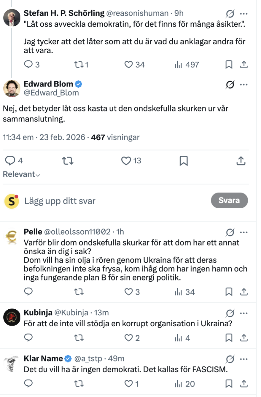 Blom menar dock att det är rätt att kasta ut den “ondskefulla skurken”. Därefter påpekar en annan person att det inte är demokrati som Blom förespråkar, utan att det snarare kan beskrivas som fascism.