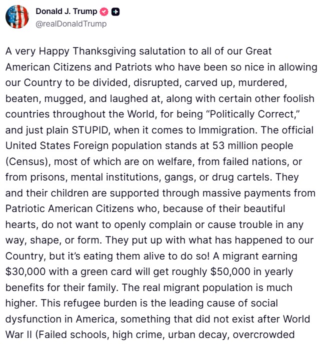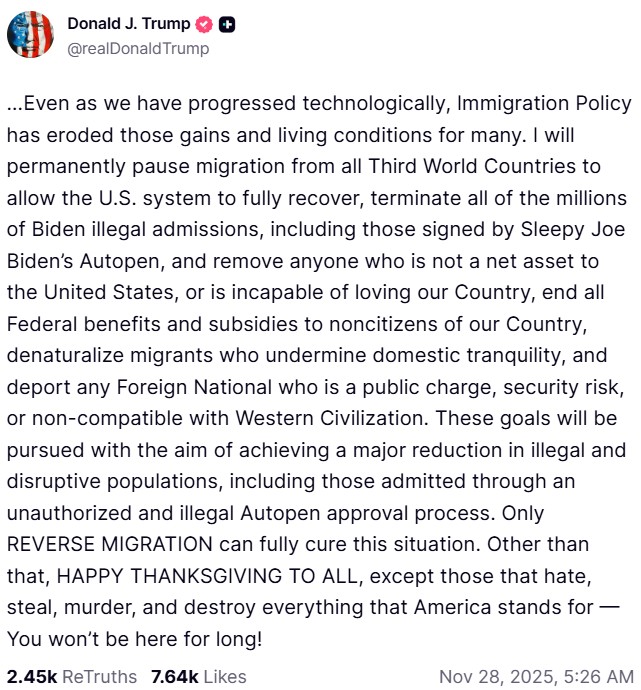 I ett inlägg på Truth Social skriver Trump att han nu stoppar all invandring från tredje världen-länder och slår fast att endast återvandring kan lösa situationen:
