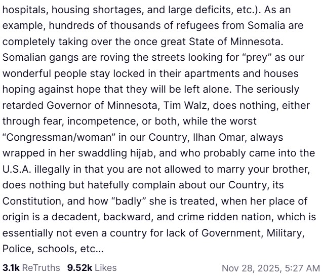 Trump tog också upp situationen i delstaten Minnesota med somaliska gäng som härjar och konstaterar att det är en grupp som är osedvanligt problematiska: