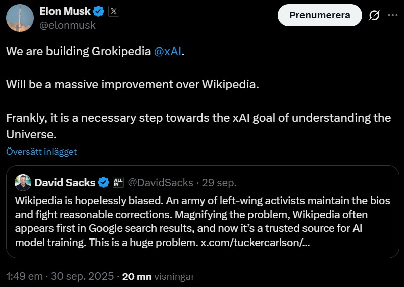 I veckan avslöjade Musk att hans xAI-startup bygger Grokipedia vilket han hävdar kommer att vara en ”massiv förbättring” jämfört med Wikipedia. Musk har länge kritiserat Wikipedia och förordat att det ska avskaffas.