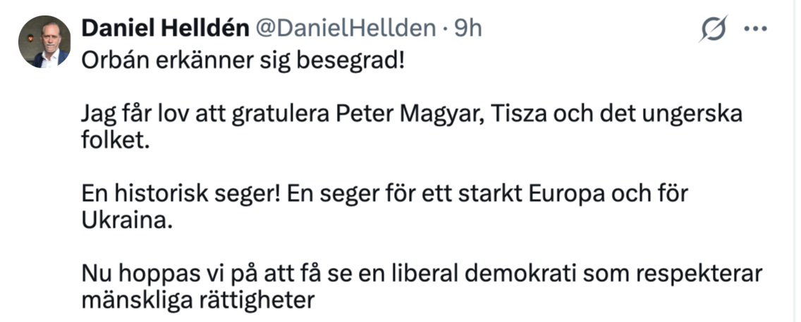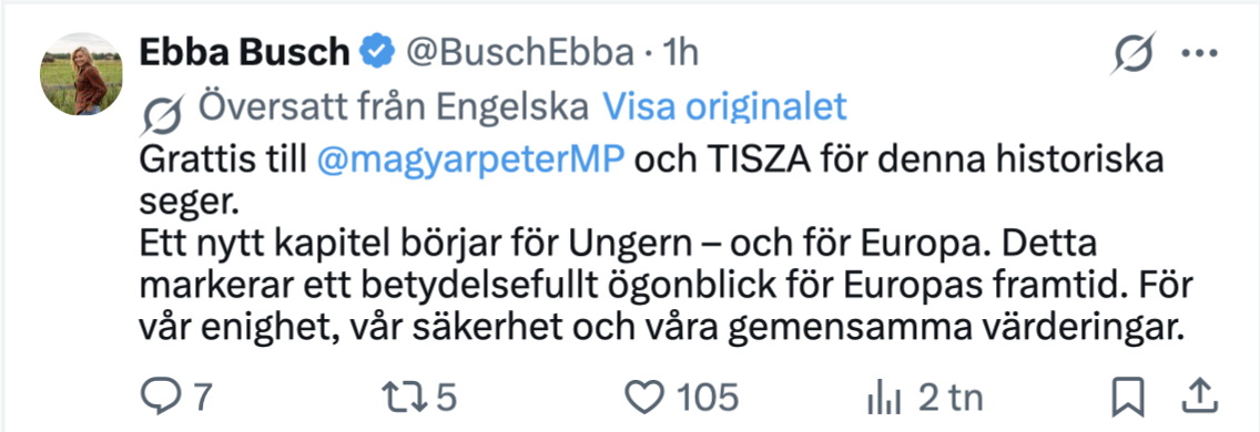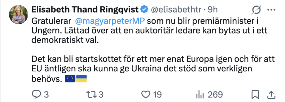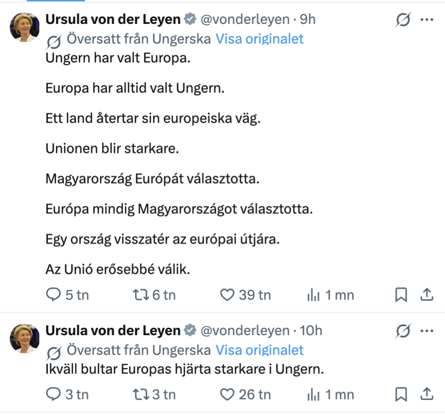 När Viktor Orbán föll på söndagskvällen gick Ursula von der Leyen ut med ett hyllningsinlägg där hon skrev att ”Europas hjärta bultar i Ungern” och att landet, som under Orbán varit starkt kritiskt till Bryssels politiska linje, nu är på ”sin europeiska väg”.