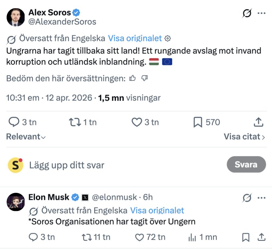Världens mest förmögne man, Teslamiljardären Elon Musk, har kommenterat valresultatet i Ungern. Han gjorde det genom ett inlägg som svar på ett uttalande från Alex Soros, son till den kontroversiella affärsmannen George Soros och ordförande för den asylaktivistiska stiftelsen Open Society Foundations, som enligt kritiker varit delaktig i att stödja migration till Europa, och som firade att ”ungrarna har tagit tillbaka sitt land”.