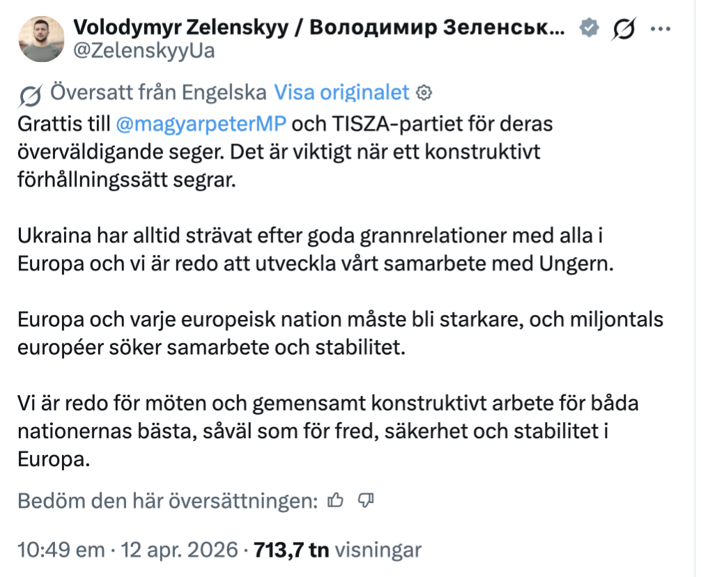 Volodymyr Zelenskyj, som nu i och med Viktor Orbáns förlust kan räkna med minskat motstånd i EU, har uttryckt sin uppskattning av valresultatet på sociala medier. Han skriver att Ukraina redan ”är redo för möten”.