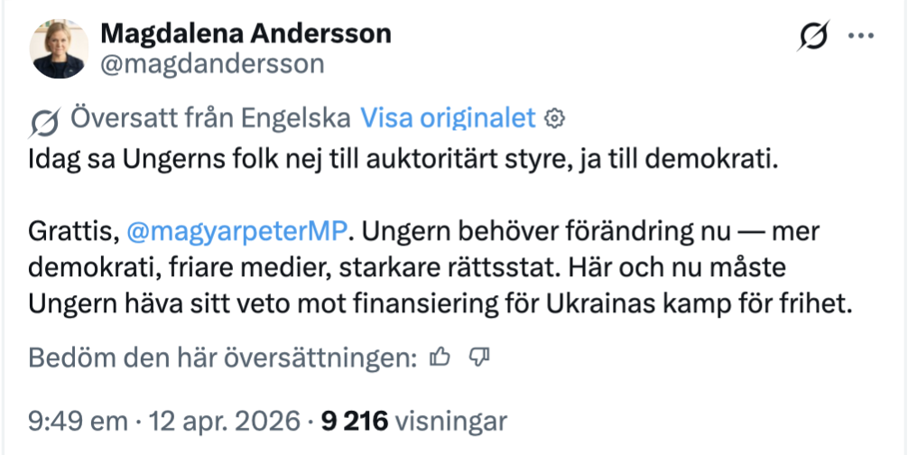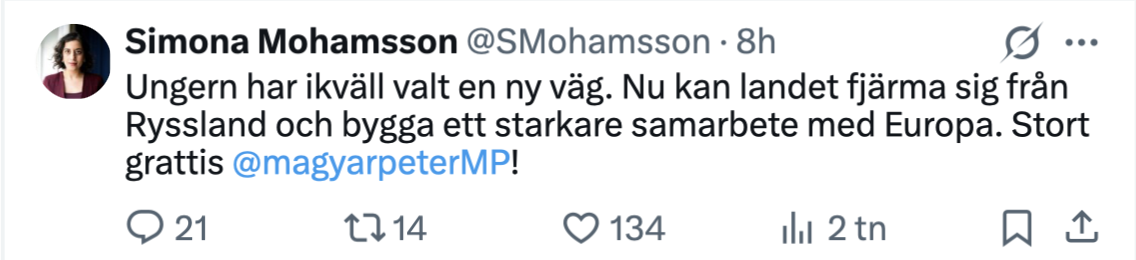 Även Socialdemokraternas partiledare Magdalena Andersson kommenterade valet och menade att ungrarna valt bort auktoritära tendenser till förmån för demokratiska värden.