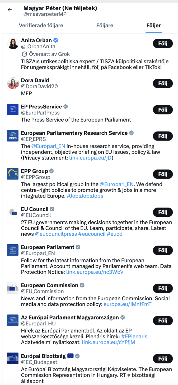 Att Péter Magyar är EU-vänlig har inte undgått någon, och det förstärks även av hans följarlista på sociala medier som visar en tydlig slagsida. Av de tio konton han följer är åtta kopplade till olika EU-relaterade områden.