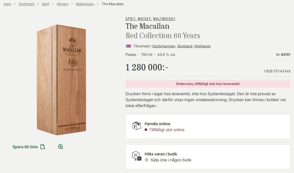 Det var i måndags som Systembolaget lade ut flaskan till försäljning via sin hemsida. För 1 280 000 kronor kunde 70 centiliter whisky som lagrats i en sherrytunna i 60 år bli din.