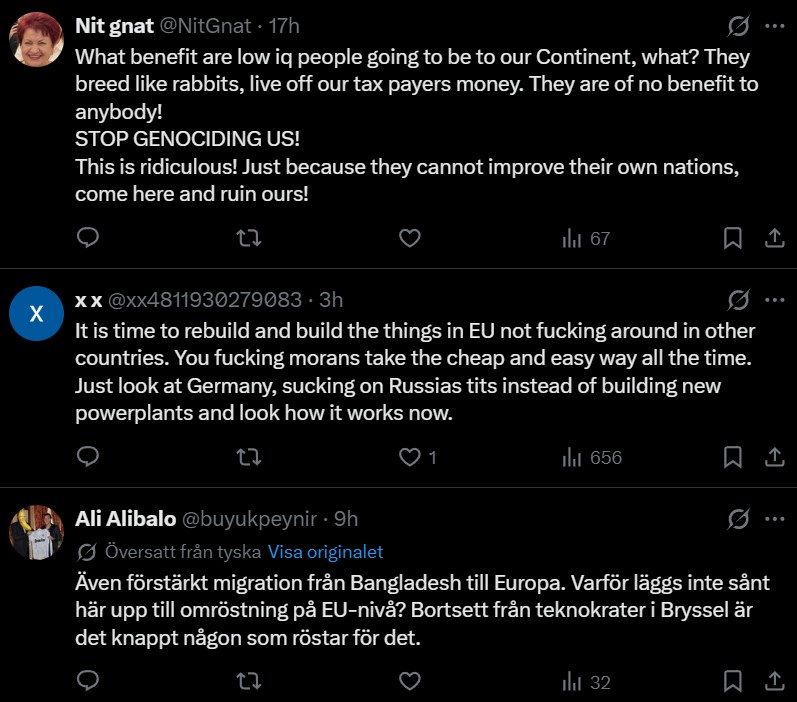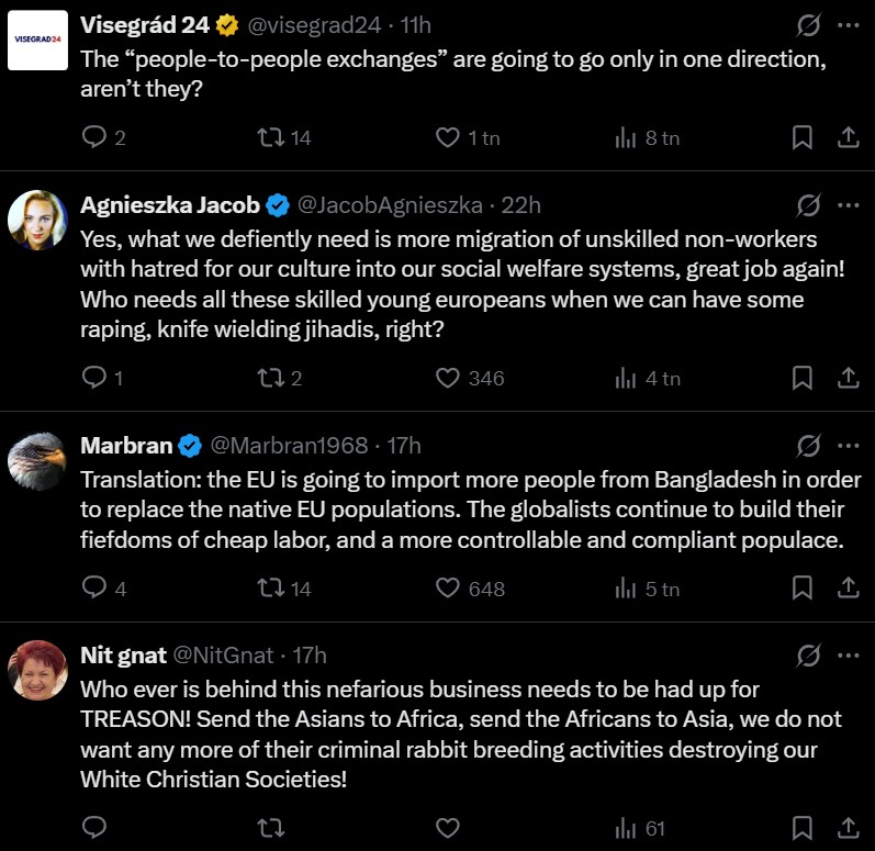 På X blev det många ilskna reaktioner på EU:s inlägg om avtalet och potentiellt ännu mer invandring: