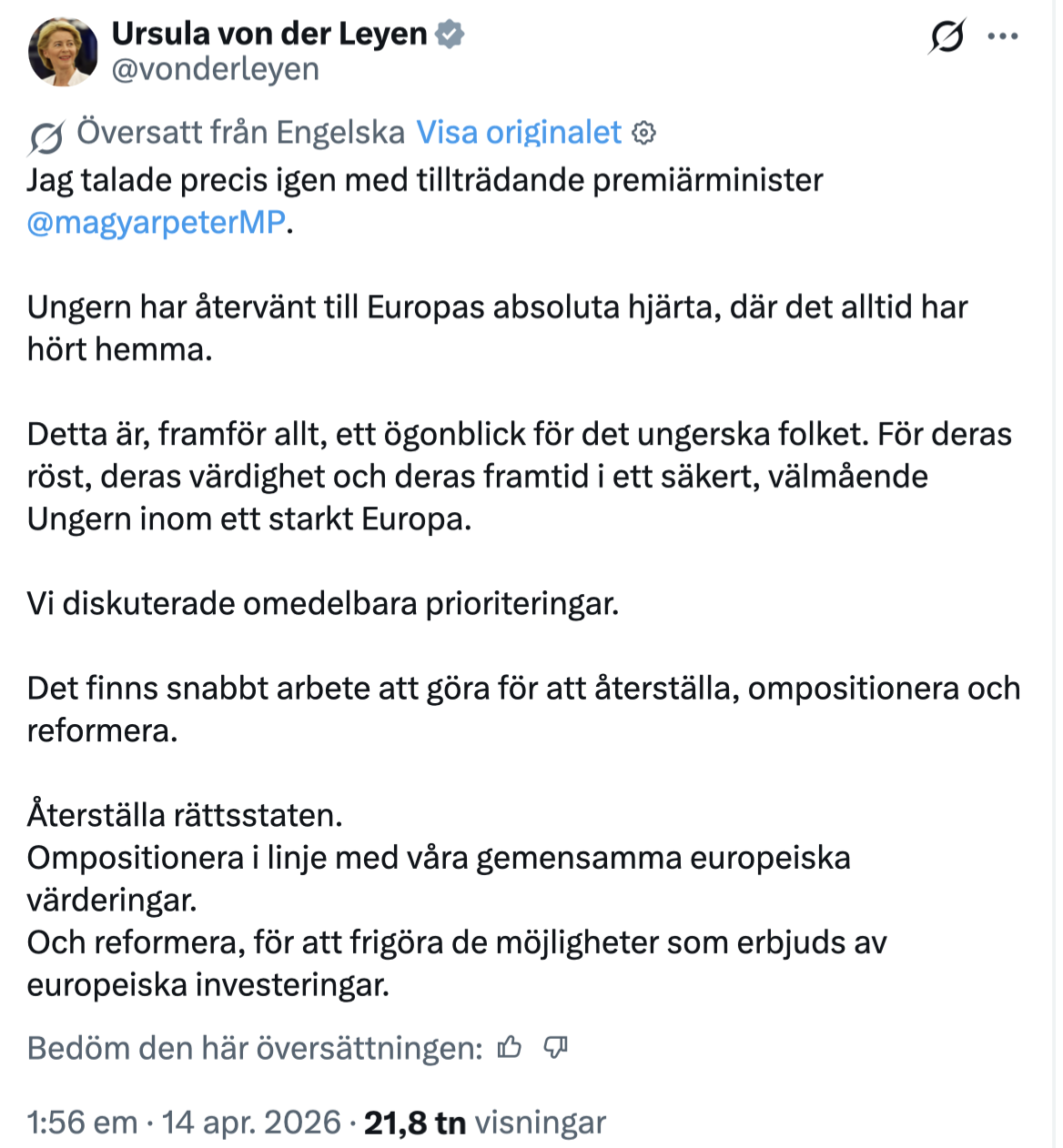 EU-kommissionens ordförande Ursula von der Leyen har samtidigt uttryckt att kommissionen är redo att arbeta snabbt med den nya regeringen, men understryker att Ungern måste återgå till vad hon beskriver som den europeiska vägen. EU-tjänstemän beskriver det nya politiska läget som ett starkt mandat för förändring, men betonar samtidigt att detta också innebär höga förväntningar på snabba och konkreta reformer.
