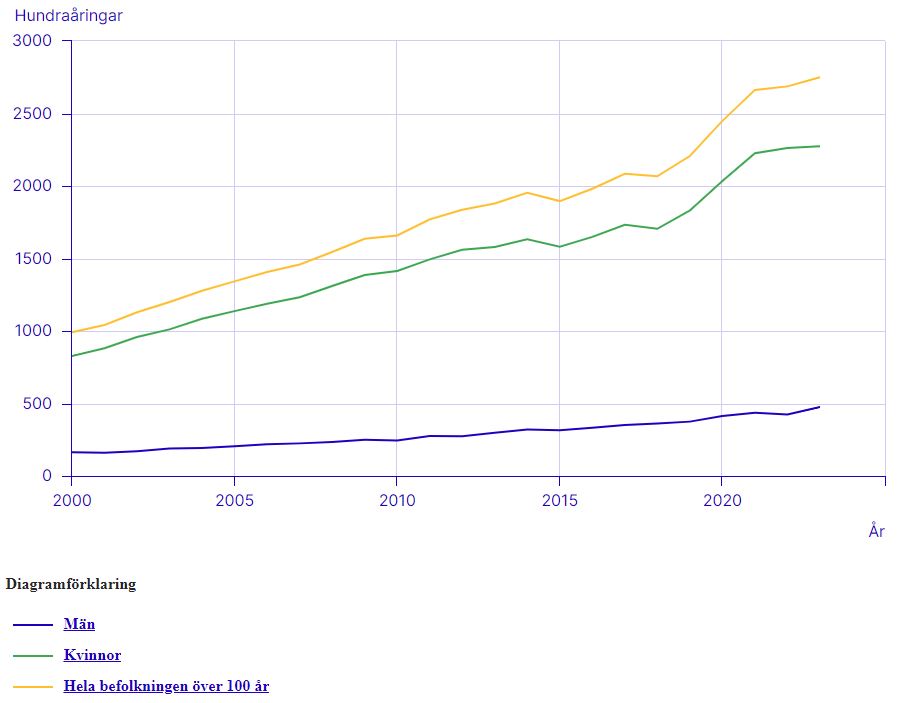 I slutet av 2023 var 2 274 kvinnor över hundra men bara 476 män.