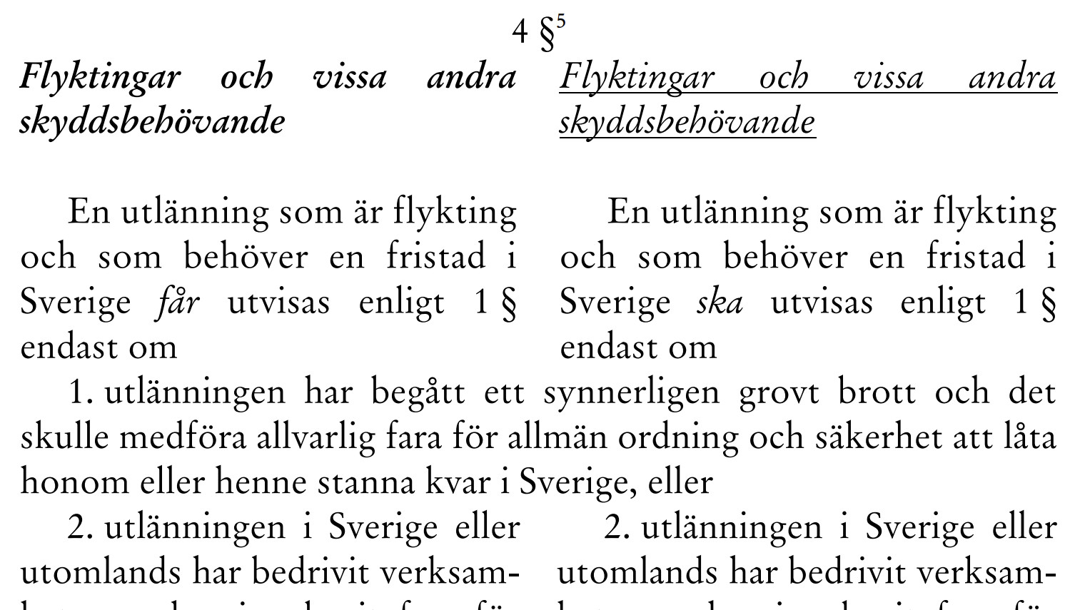 . För denna grupp, vilken inte minst omfattar de migranter som kom från Syrien under migrantkrisen, krävs att de begår ett grovt brott eller utgör en fara för samhället eller Sveriges säkerhet, för att de ska kunna utvisas.
