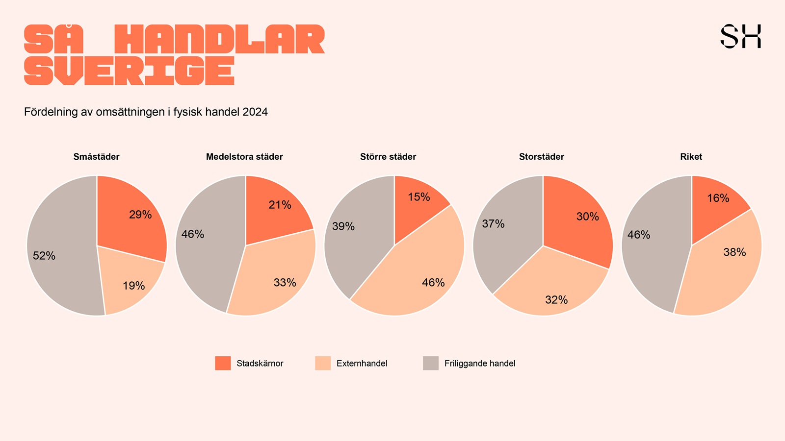I rapporten ”Handelskartan – så handlar Sverige” framgår samtidigt att majoriteten av svenskarnas handel fortsatt sker i fysiska butiker. På nationell nivå står fysisk handel för 86 procent av detaljhandelns omsättning, fördelat på stadskärnan med 14 procent, externhandeln med 33 procent och den så kallade friliggande handeln med 39 procent.