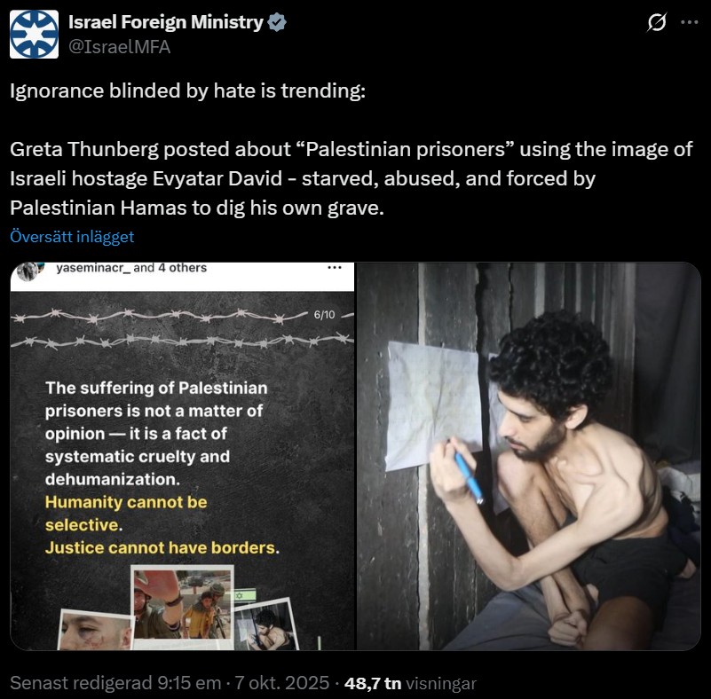 Samtidigt har Thunberg gjort bort sig rejält genom att på sociala medier dela en bild av påstådda palestinska offer för Israels krig mot Hamas där en av bilderna i själva verket är en israelisk gisslan – Evyatar David som tvingades gräva sin egen grav hämtad ur Hamas propaganda: