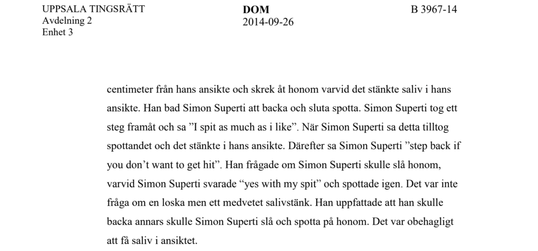 När Uppsala tingsrätt meddelade domen hösten 2014 tog domstolen Supertis parti och ansåg att spottet inte var något annat än sådant som flög ut av frustrationen.