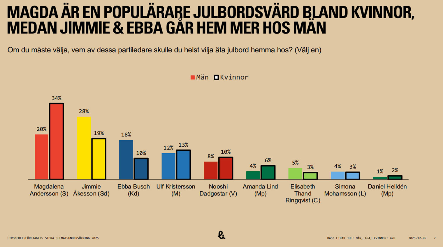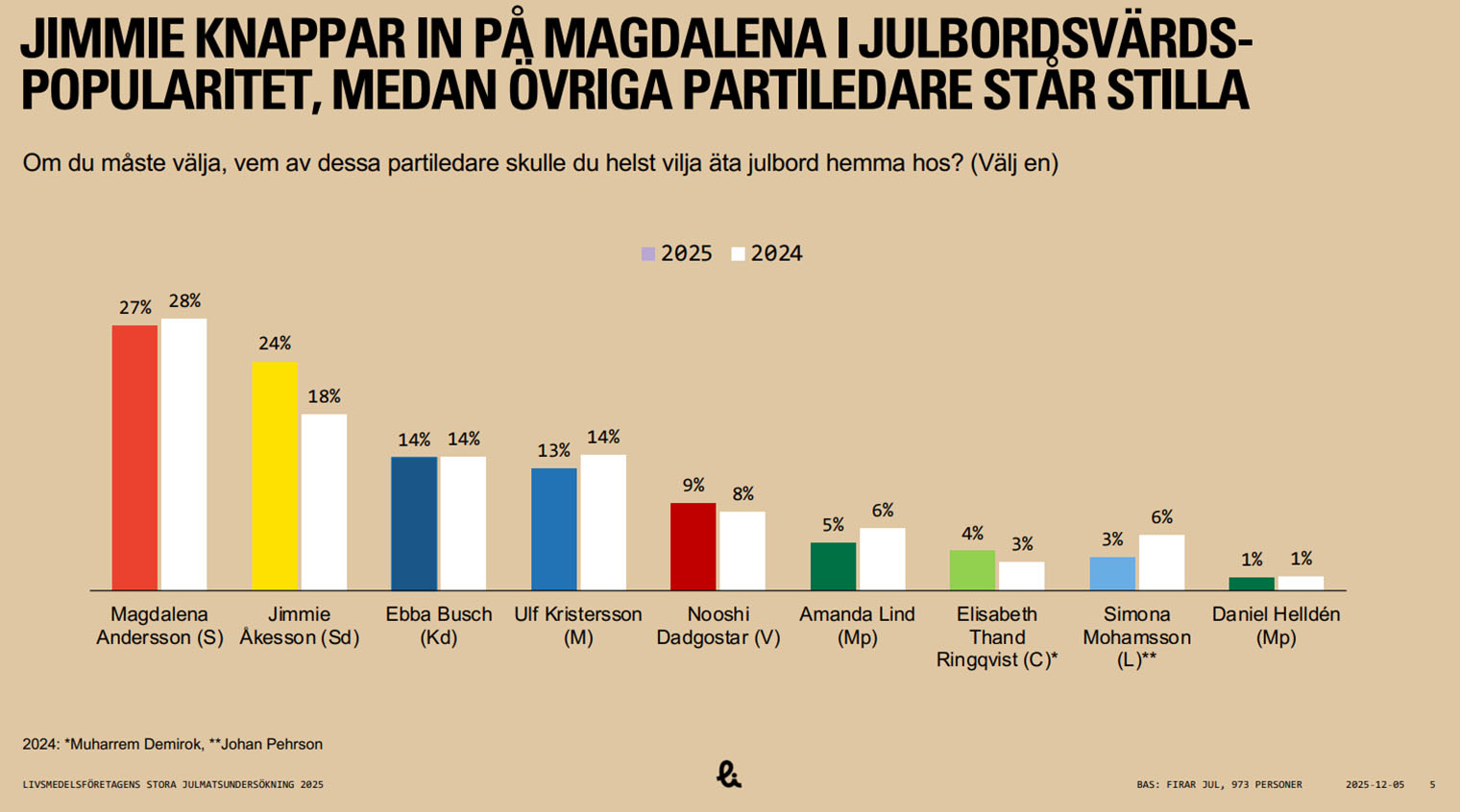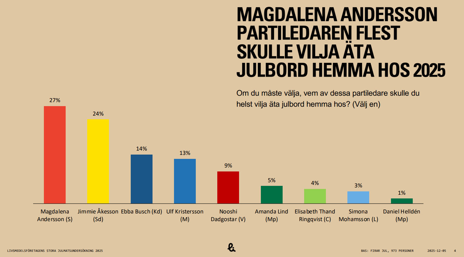 Med mindre än ett år kvar till riksdagsvalet har Livsmedelsföretagen, via Demoskop, låtit 1 006 svenskar svara på vilken partiledare de helst skulle vilja äta julbord hos. Resultatet visar att Magdalena Andersson (S) är fortsatt mest populär. Hon samlar 27 procent av rösterna och behåller därmed förstaplatsen från förra året.