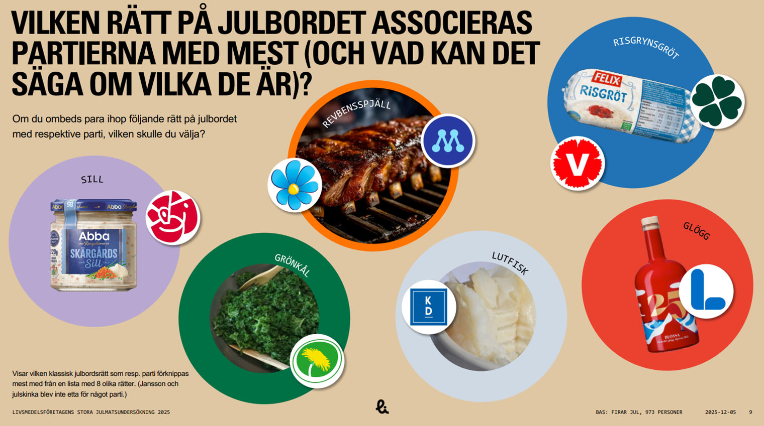 Sillen – som hela 92 procent av svenskarna har på sitt julbord – kopplas starkast till Socialdemokraterna. Moderaterna och Sverigedemokraterna förknippas i stället med revbensspjäll, medan Kristdemokraterna får rollen som lutfiskens parti.