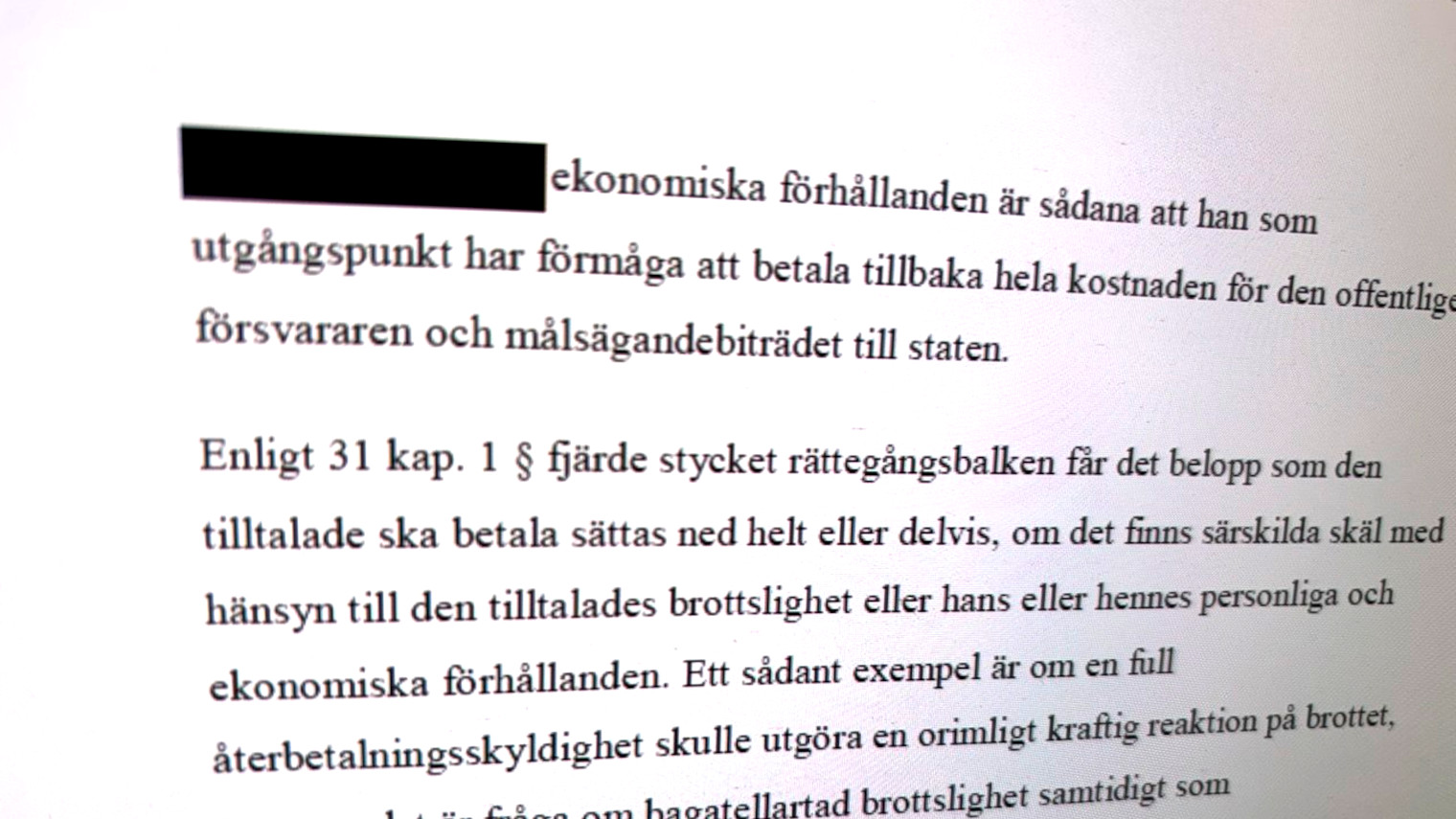 Nacka tingsrätt menar i sin dom att 38-åringens ”ekonomiska förhållanden är sådana att han som utgångspunkt har förmåga att betala tillbaka hela kostnaden för den offentlige försvararen och målsägandebiträdet till staten”, står att läsa i domen.