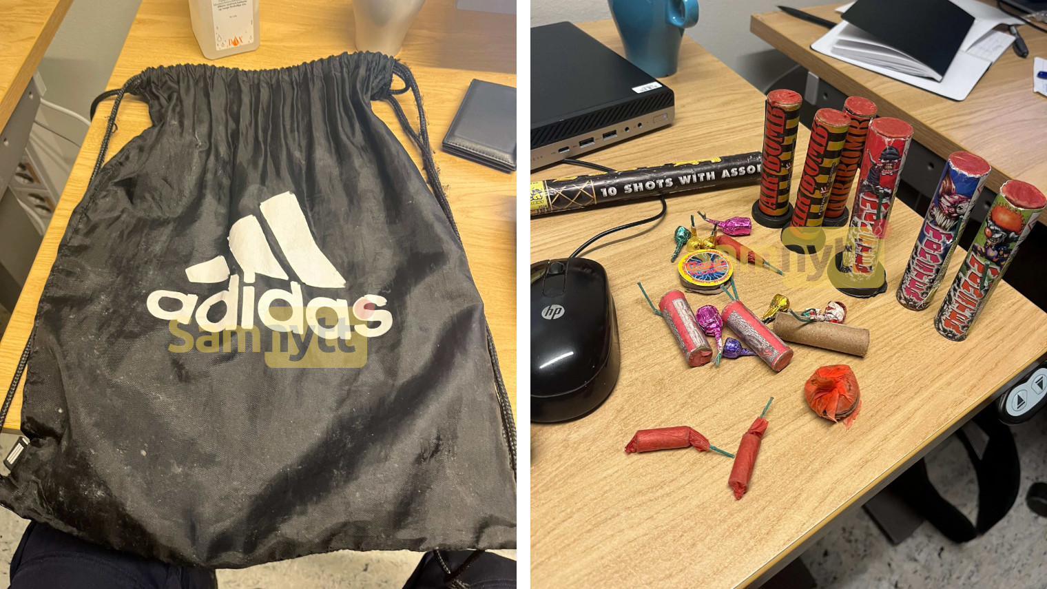 Den 38-årige mannen lyckas få tag i gymnastikpåsen med fyrverkerierna i. Därefter försöker han ta sig därifrån, men gänget följer efter honom samtidigt som de tar fram sina mobiltelefoner för att ringa in förstärkning.