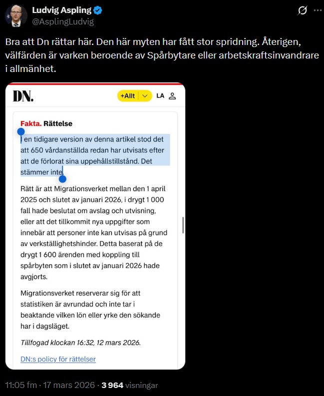 I den aktuella artikeln låg fokuset på spårbytet, där personer som fått avslag på sin asylansökan kunde stanna i Sverige genom att i stället få arbetstillstånd. Denna möjlighet avskaffades den 1 april 2025. Nyligen mildrade regeringen och Sverigedemokraterna migrationslinjen och pausar ”tonårsutvisningarna” efter kritik.