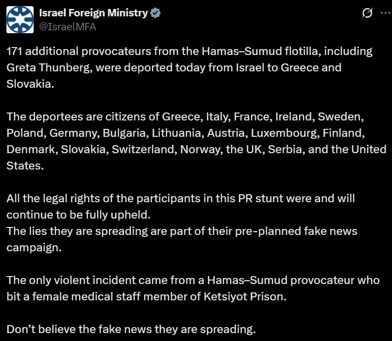 På måndagen meddelar israeliska myndigheter att 171 ”provokatörer från Hamas–Sumud-flottiljen, inklusive Greta Thunberg” i dag utvisades från Israel till Grekland och Slovakien.