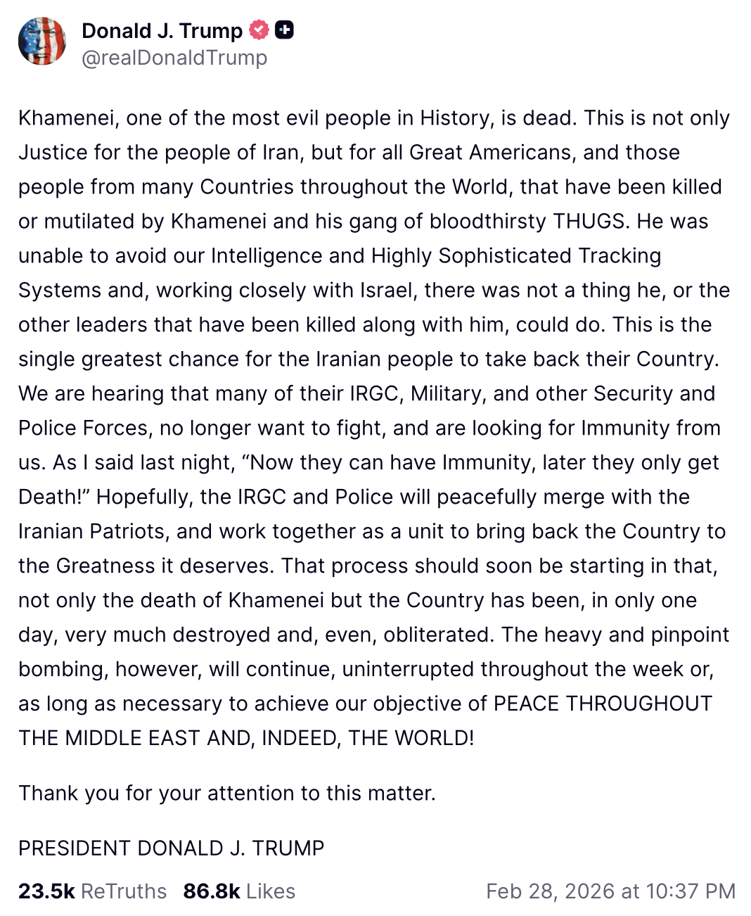 Natten mot söndag bekräftade statliga medier i Iran att Ali Khamenei hade dödats i attacken. Flera av hans familjemedlemmar uppges också ha omkommit.