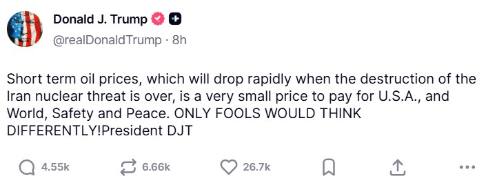 I ett inlägg på sociala medier skrev Trump att oljepriserna ”kommer att sjunka snabbt när förintelsen av det iranska kärnvapenhotet är över” och sa att prisökningen var ”ett mycket litet pris att betala för USA, världens säkerhet och fred”.