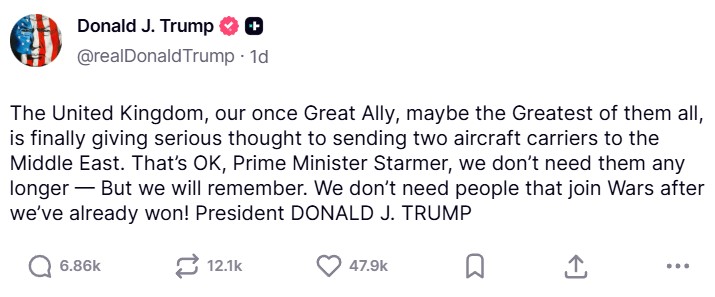 Samtidigt har Trump uttryckt missnöje med den brittiska regeringen och premiärminister Keir Starmers tvekande inför att ansluta sig till kampen mot Iran. I ett inlägg på Truth Social skriver Trump att skicka två hangarfartyg så här långt i efterhand inte längre behövs och att man inte behöver folk som går med i krig efter att de redan vunnits: