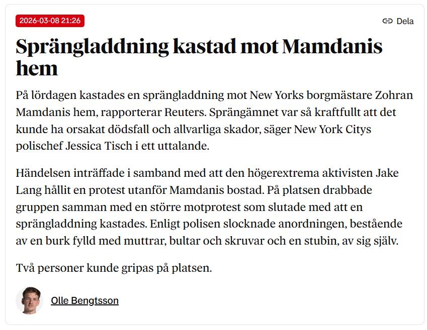I samband med en islamkritisk manifestation utanför New Yorks muslimske borgmästares bostad kastade en motdemonstrant – som svor trohet till terrorgruppen Islamiska staten – någon form av sprängladdning mot samlingen. I medierna får man det dock till att det var de islamkritiska demonstranterna som kastat anordningen.